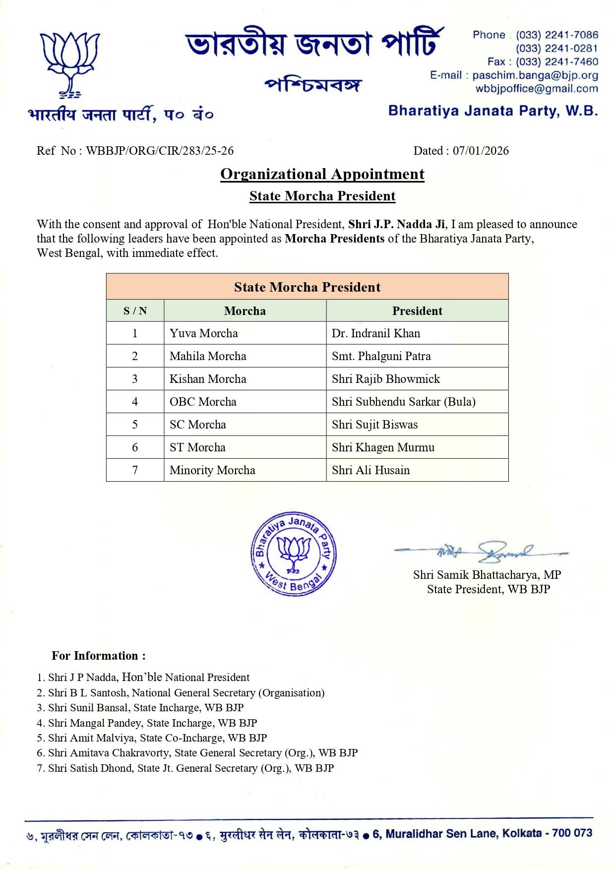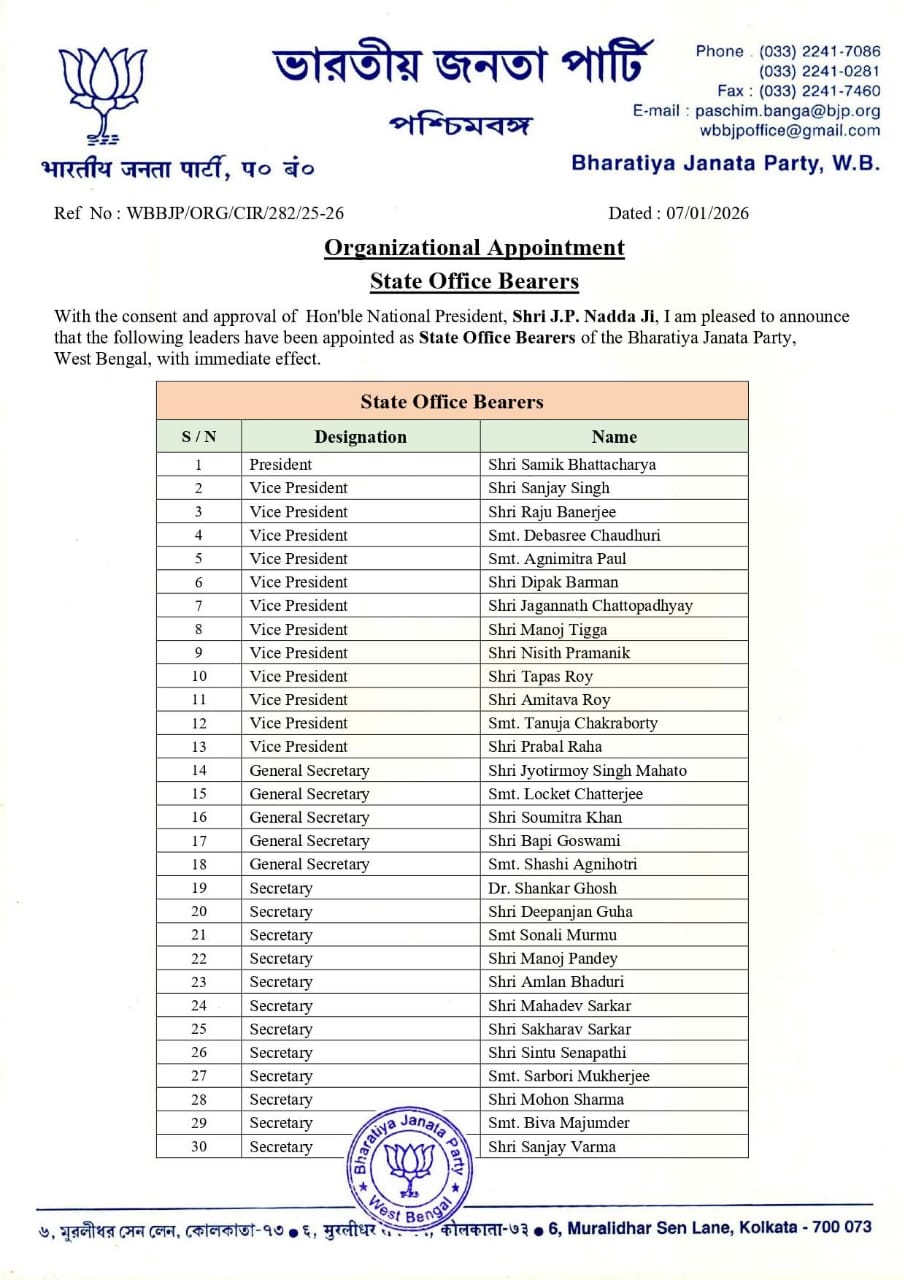 पूर्व प्रदेश अध्यक्ष दिलीप घोष को प्रदेश समिति से बाहर रखा गया है, जबकि केंद्रीय नेतृत्व ने हाल ही में वरिष्ठ नेताओं से राजनीतिक रूप से सक्रिय रहने का आग्रह करते हुए संदेश जारी किए थे।