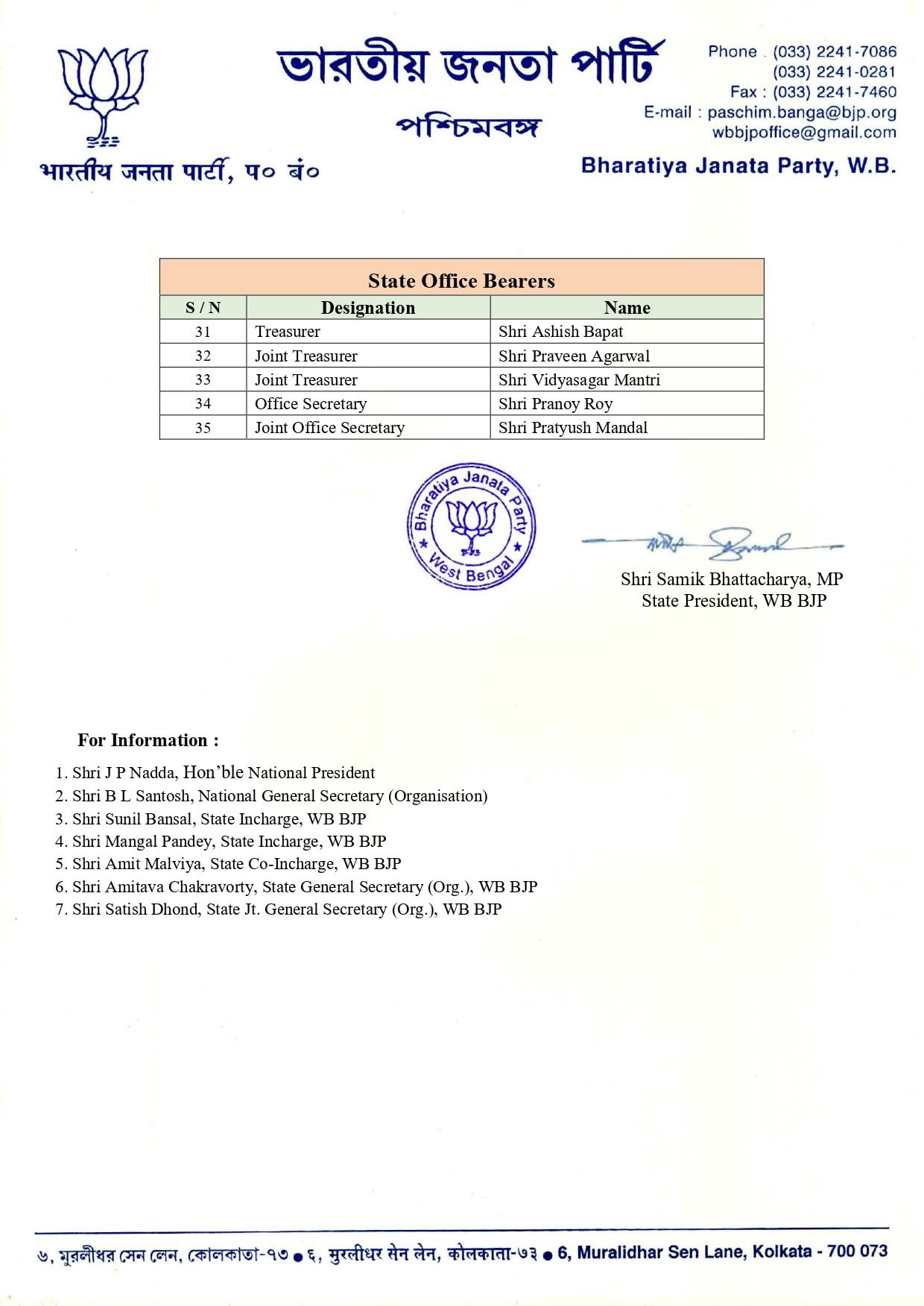 कोलकाता : विधानसभा चुनाव से पहले भारतीय जनता पार्टी ने पश्चिम बंगाल प्रदेश समिति की घोषणा की आज यानि की बुधवार को घोषणा कर दी। भाजपा ने पुराने नेताओं को साथ लेकर चलते हुए, आंतरिक गुटबाजी को नियंत्रित करते हुए अपनी राज्य समिति का गठन किया है । गत वर्ष जुलाई में समिक भट्टाचार्य के प्रदेश अध्यक्ष के रूप में कार्यभार संभालने के लगभग छह महीने बाद 35 सदस्यीय समिति की घोषणा की गई।