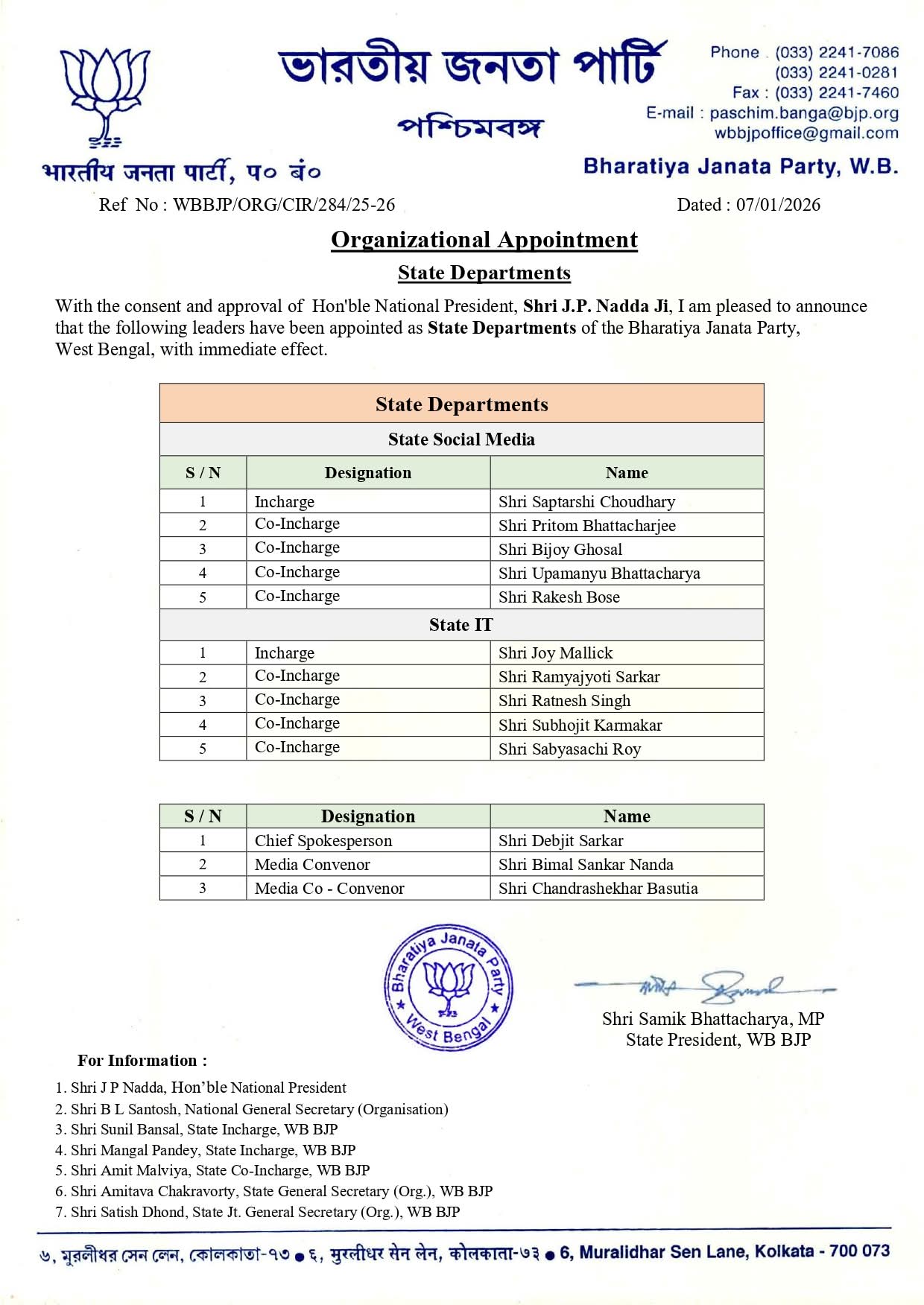 कोलकाता : विधानसभा चुनाव से पहले भारतीय जनता पार्टी ने पश्चिम बंगाल प्रदेश समिति की घोषणा की आज यानि की बुधवार को घोषणा कर दी। भाजपा ने पुराने नेताओं को साथ लेकर चलते हुए, आंतरिक गुटबाजी को नियंत्रित करते हुए अपनी राज्य समिति का गठन किया है । गत वर्ष जुलाई में समिक भट्टाचार्य के प्रदेश अध्यक्ष के रूप में कार्यभार संभालने के लगभग छह महीने बाद 35 सदस्यीय समिति की घोषणा की गई।