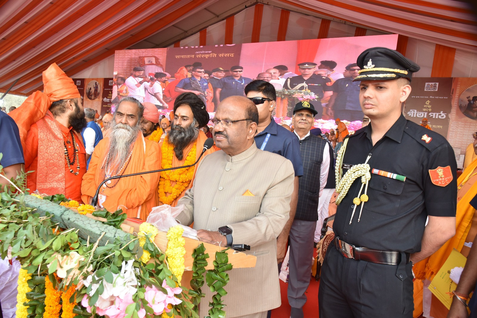 भगवद गीता से पाठ करते हुए गवर्नर ने कहा, “परित्राणाय साधूनां विनाशाय च दुष्कृताम् धर्म-संस्थापनार्थाय सम्भवामि युगे युगे”, जिसका अर्थ है “सज्जनों की रक्षा के लिए, दुष्टों का विनाश करने के लिए, और धर्म के सिद्धांतों को फिर से स्थापित करने के लिए मैं हर युग में इस धरती पर प्रकट होता हूं।” ‘पंच लक्खो कोंठे गीता पाठ’ (पांच लाख आवाजों में गीता पाठ) कार्यक्रम सनातन संस्कृति संसद द्वारा आयोजित किया गया था, जो विभिन्न मठों और हिंदू धार्मिक संस्थानों के साधुओं और आध्यात्मिक नेताओं का एक समूह है।