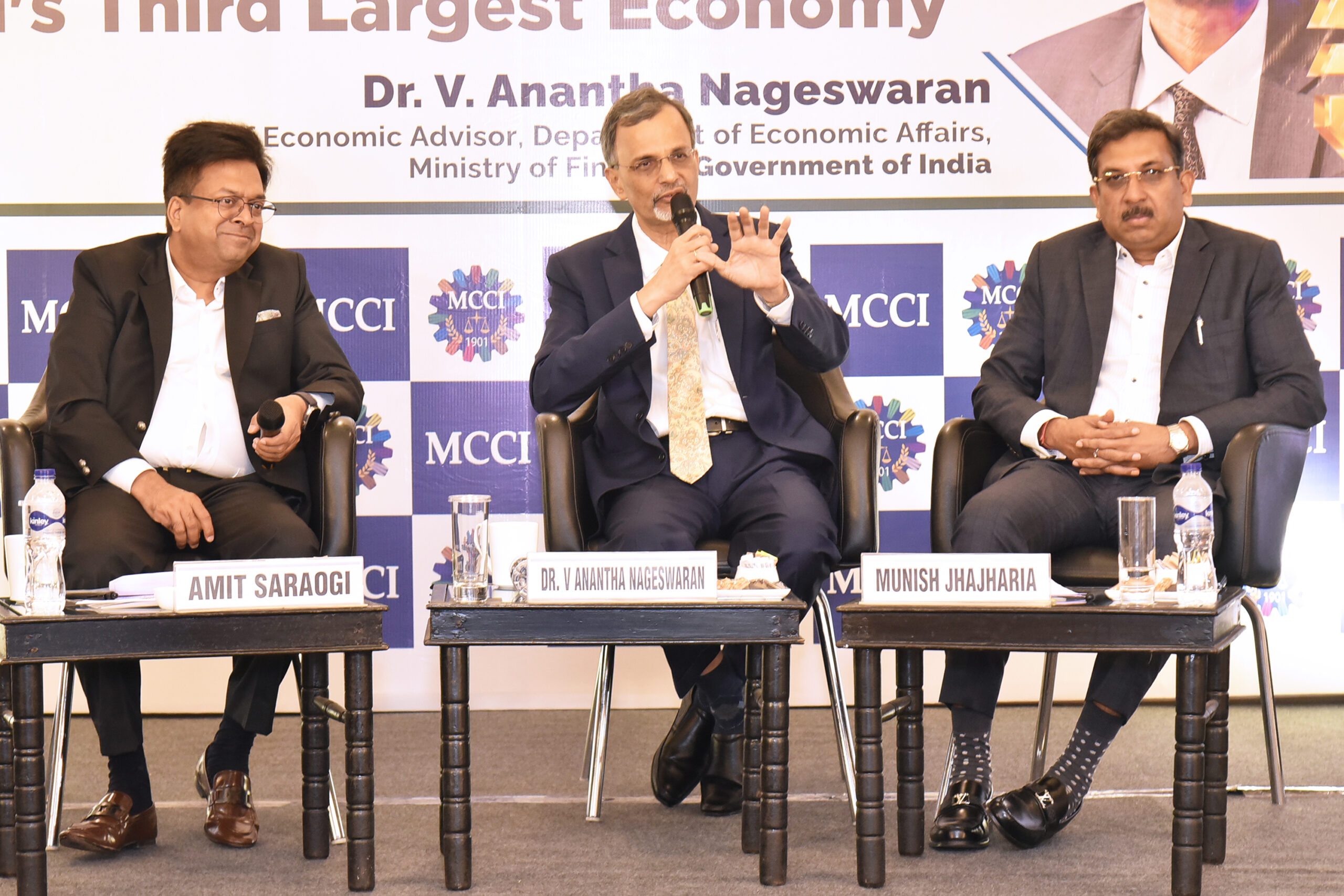 कोलकाता : मर्चेंट्स चैंबर ऑफ कॉमर्स एंड इंडस्ट्री (Merchants’ Chamber of Commerce and Industry) ने “भारत@3: दुनिया की तीसरी सबसे बड़ी अर्थव्यवस्था बनने का मार्ग” विषय पर डॉ. वी. अनंत नागेश्वरन, मुख्य आर्थिक सलाहकार, आर्थिक मामलों का विभाग, वित्त मंत्रालय, भारत सरकार के साथ एक विशेष सत्र का आयोजन किया।