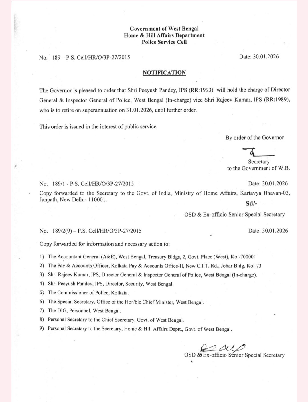 जारी आदेश के अनुसार, 1993 बैच के अधिकारी पांडे अगले आदेश तक कार्यभार संभालेंगे। 1989 बैच के आईपीएस अधिकारी राजीव कुमार 31 जनवरी को सेवानिवृत्त होने वाले हैं।