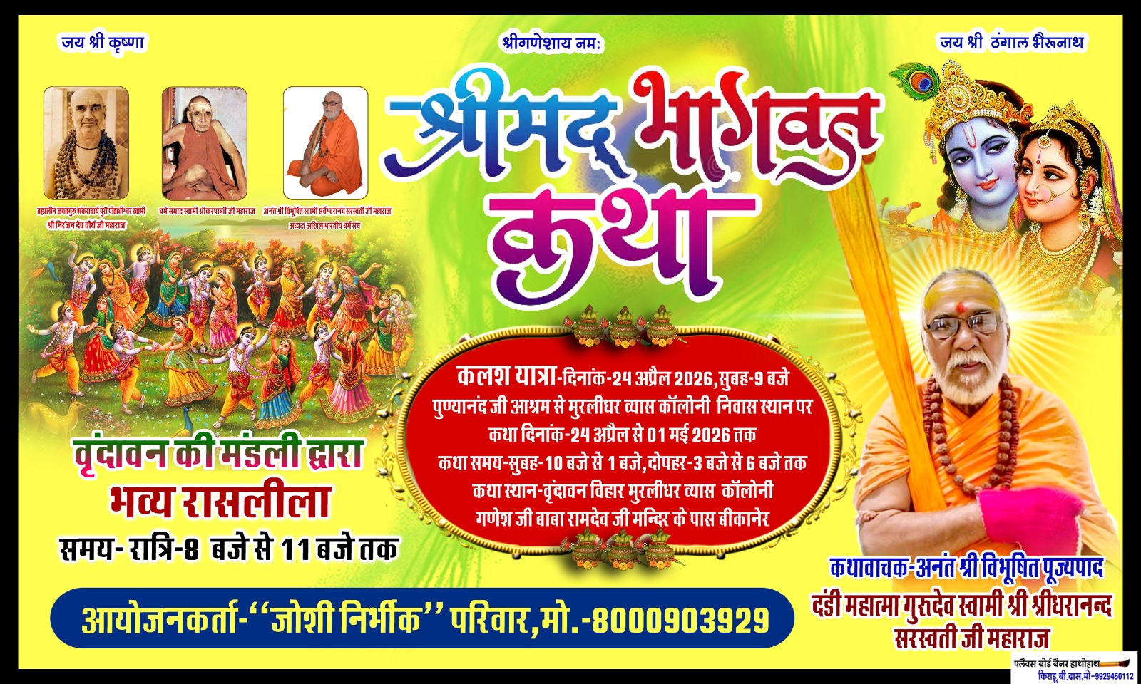 जोशी न‍िर्भीक पर‍िवार ने कहा क‍ि यह बताते हुए बड़ा ही हर्ष हो रहा है क‍ि सपर‍िवार हम प‍ित्तरों और कुल देवी देवता व गुरुजनों के अशीर्वाद से श्रीमद् भागवत कथा ज्ञान महायज्ञ का आयोजन कर रहें है। उन्होंने कहा कि कथा स्थल वृंदावन विहार, मुरलीधर व्यास कॉलोनी (मौसम विभाग के पीछे), बीकानेर रखा गया है। यह आयोजन 24 अप्रैल को प्रातः 9 बजे भव्य कलश यात्रा के साथ शुरू होगी । वहीं कथा का समय प्रातः 10 बजे से 1 बजे तक एवं दोपहर 3 बजे से 6 बजे तक भक्‍तों की सुव‍िधा को देखते हुए रखा गया है। कार्यक्रम का विशेष आकर्षण प्रतिदिन रात्रि 8 बजे से 11 बजे तक वृंदावन की मंडली द्वारा भव्य रासलीला का मंचन होगा। जोशी न‍िर्भीक पर‍िवार ने श्रीमद् भागवत प्रेम‍ियों से पुण्‍य प्राप्‍त‍ि के ल‍िए सपरिवार पधारने की प्रार्थना की है।